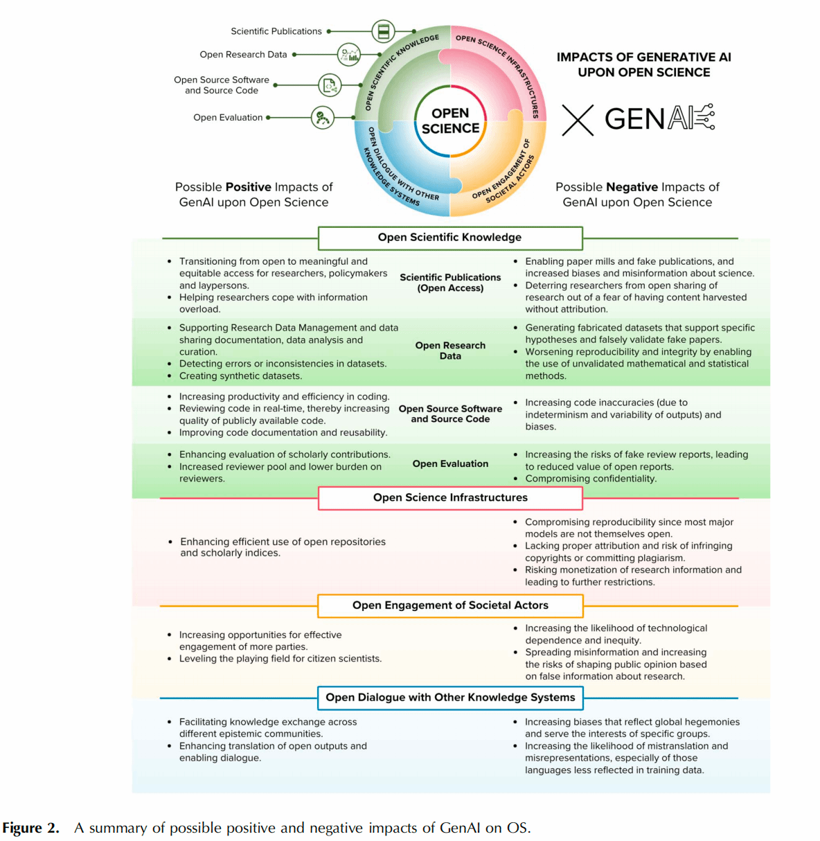 在探讨这些影响时,存在三个关键议题:一是与所谓“有意义的获取”相关。OS运动长期致力于推动研究成果与材料的开放获取,包括开放获取论文和开放数据。然而,这些成果往往未能以公众可理解或有效参与的形式呈现。虽然GenAI能够促进有意义且公平的获取,但它并非无风险——这种使用创造了一种认知依赖,许多用户可能无法批判性地验证GenAI的输出,同时还面临着有意或战略性滥用学术内容的风险。由GenAI带来的错误信息或虚假信息的产生和传播风险,构成了第二个反复出现的议题。三是学术研究的多样性与包容性受到影响。GenAI通过提升对学术成果的实质获取能力、增强研究过程参与度,可能促进学术生态包容性与主体多元化。但需警惕的是,其模型机制与训练数据中固有的偏见可能强化特定世界观,最终阻碍OS多元价值的实现。