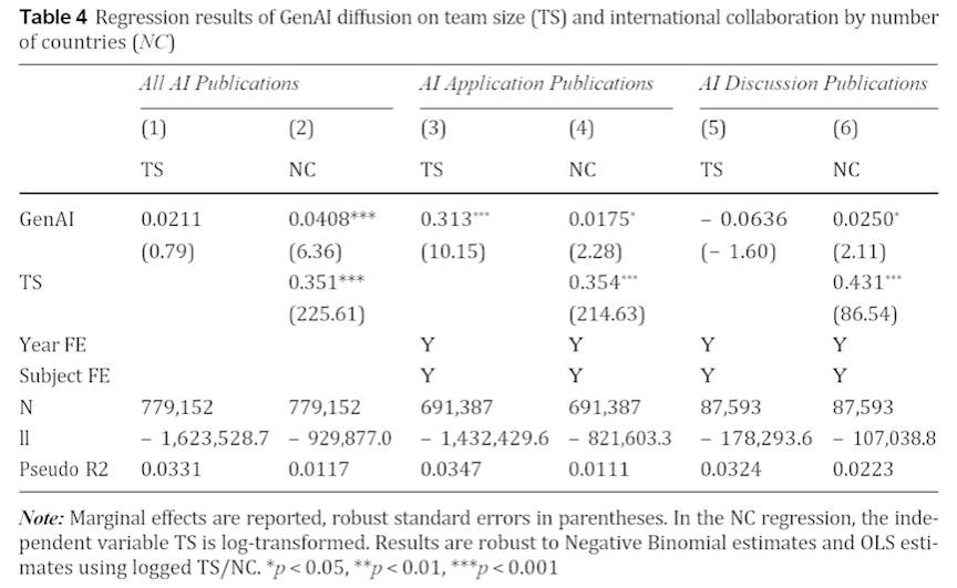 研究结果表明,不仅GenAI相关文献数量快速增长,其应用范围也从计算机科学扩展至多学科领域。美国研究人员贡献了全球近五分之二的GenAI文献,而中国研究人员贡献了近三分之一。此外,多个中小型发达经济体在GenAI研究应用方面也表现出较高水平。GenAI应用与更大的团队规模及更高的国际合作率呈显著正相关。在GenAI讨论类文献中,与国际合作的正相关性同样显著。这表明,在科学研究中应用GenAI可能需要更多的协作努力,尤其是国际合作,这可能会强化知识生产地理格局中嵌入的全球协作网络。