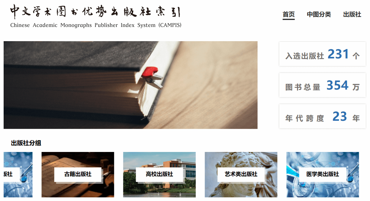 • 数据平台:“中文学术图书优势出版社索引”平台【官网点此进入】。平台集成了多维度的数据查询与分析功能,不仅支持用户按学科大类或细分学科检索核心出版社排名,还通过可视化方式展示了全国出版社的分布地图。平台能够对不同学科门类(如艺术、医学等)的出版社进行聚类展示与比较,方便用户深入了解特定领域的出版力量格局。同时,用户亦可直接查阅具体出版社的学科优势详情。该成果可视作中国自主学术评价体系建设在出版领域的一项阶段性探索。